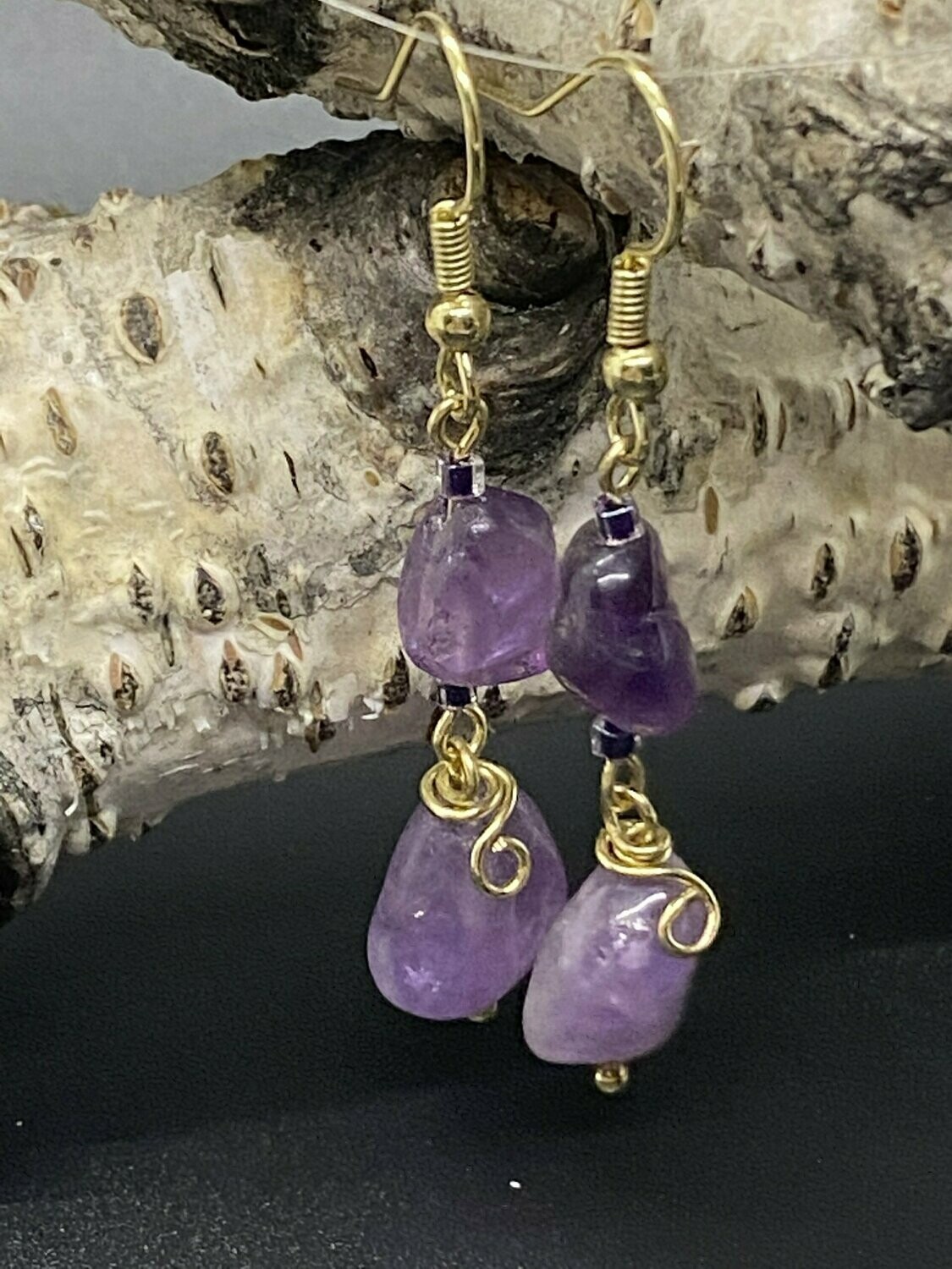 Amethyst, two tier drop earrings with gold coloured tarnish resistant wire and french hooks.